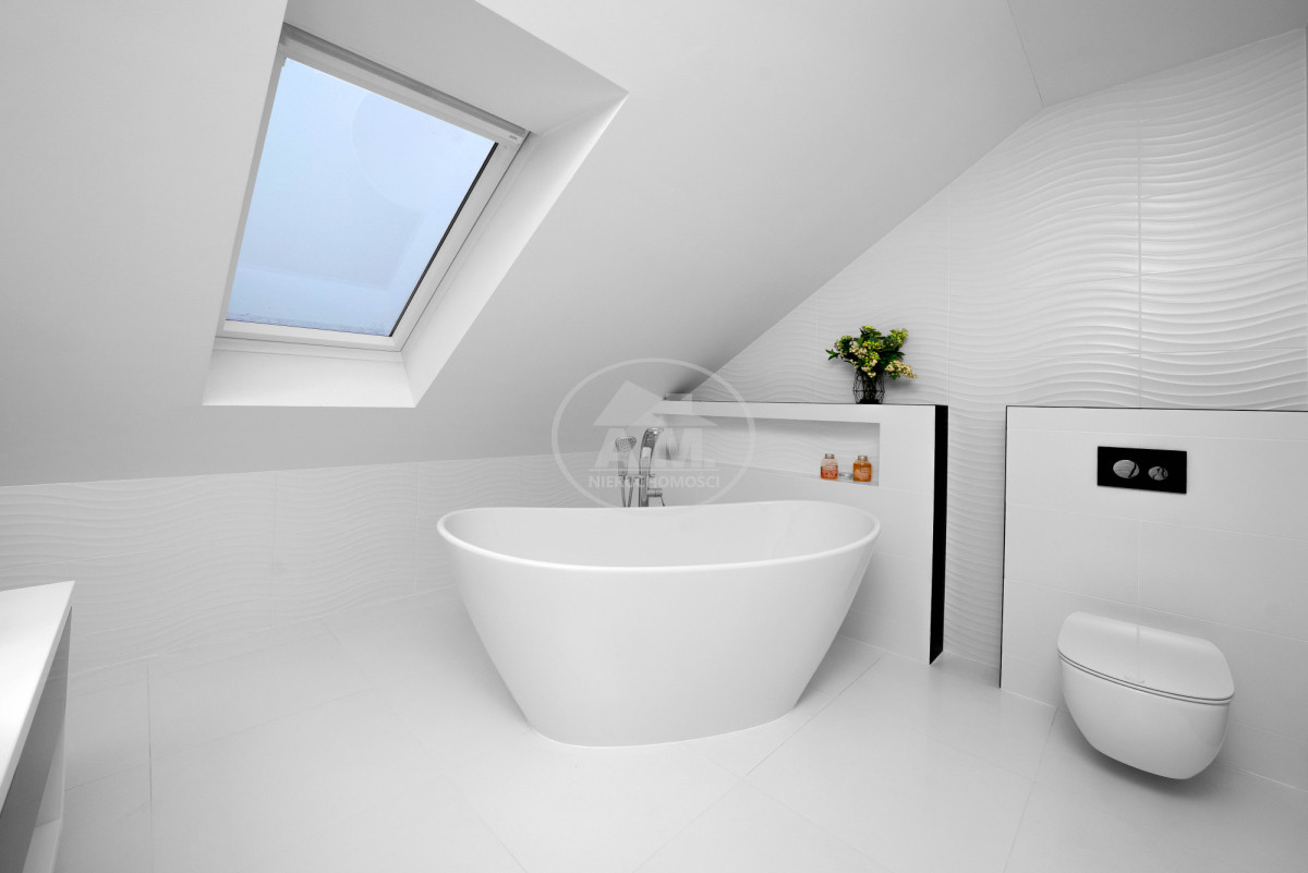- Nowoczesna łazienka z wolnostojącą wanną (ok. 6,4 m2),