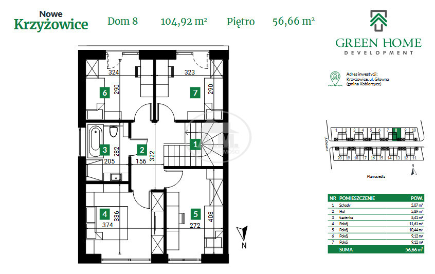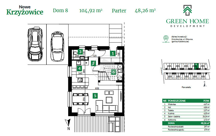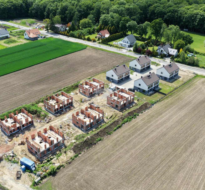 Inwestycja jest zlokalizowana w otoczeniu natury przy ul. Głównej w Krzyżowicach. Tuż obok znajdują się tereny zielone i lasy świetne na spacery, wycieczki rowerowe czy jogging.