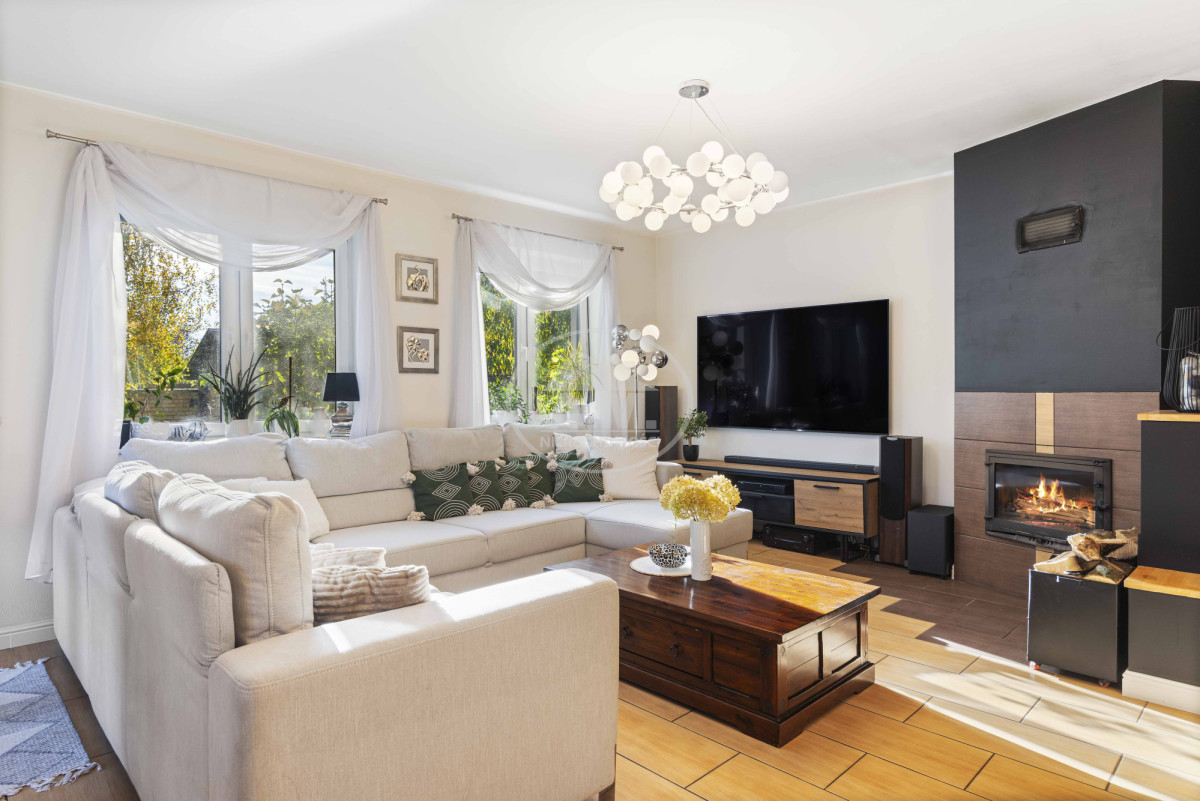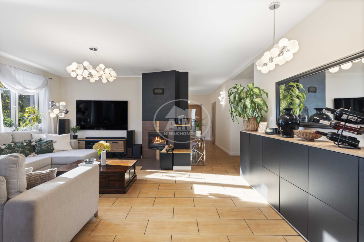 • strefa dzienna z kominkiem oraz wyjściem na drewniany taras z zadaszeniem,