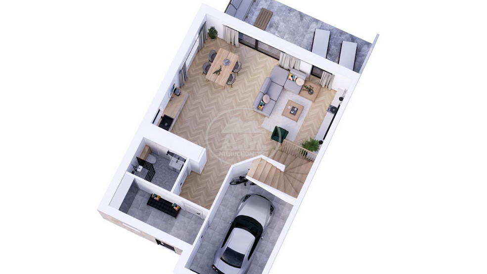 Salon z aneksem kuchennym i jadalnią, z wyjściem na ogród.