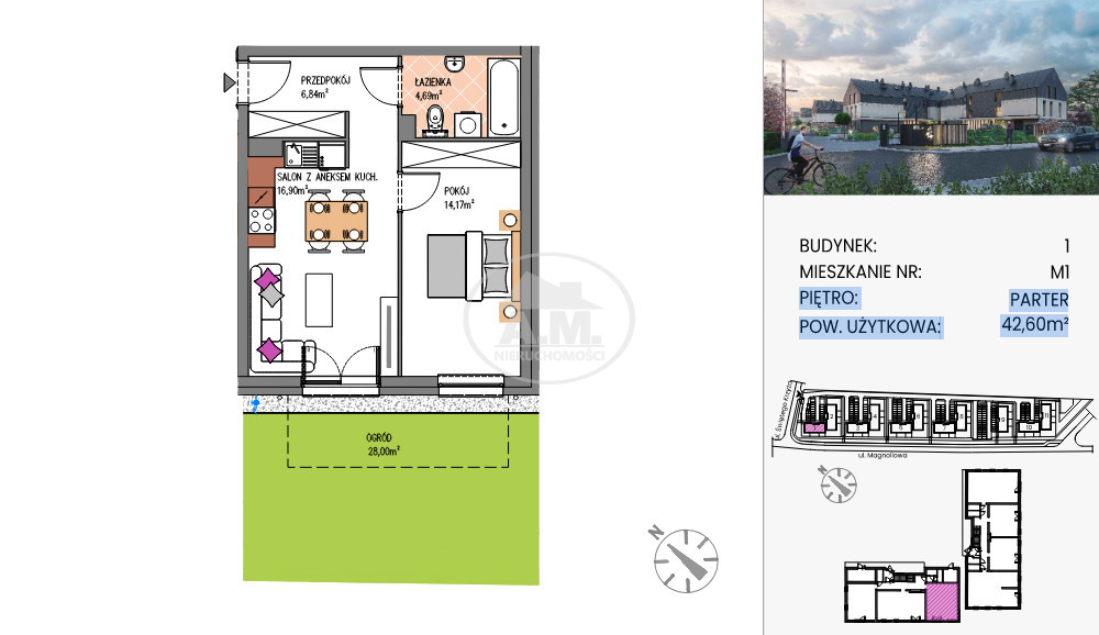 Przedstawiamy ofertę sprzedaży mieszkania o powierzchni użytkowej 42,78 m², zlokalizowanego na parterze nowoczesnego, 2-piętrowego budynku w spokojnej części Siechnic, przy ul. Magnoliowej