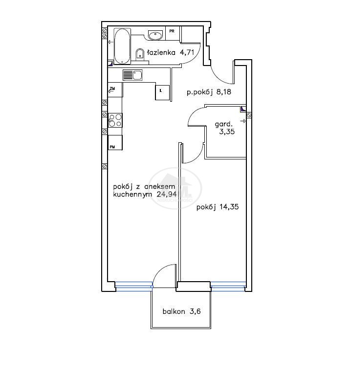 • Przestronny salon połączony z aneksem kuchennym, z bezpośrednim wyjściem na balkon.