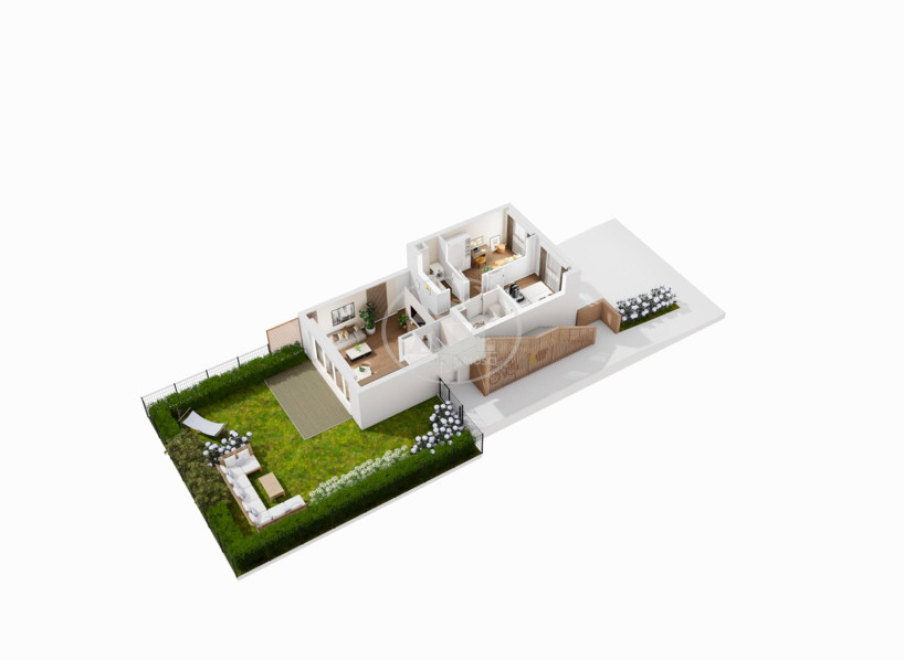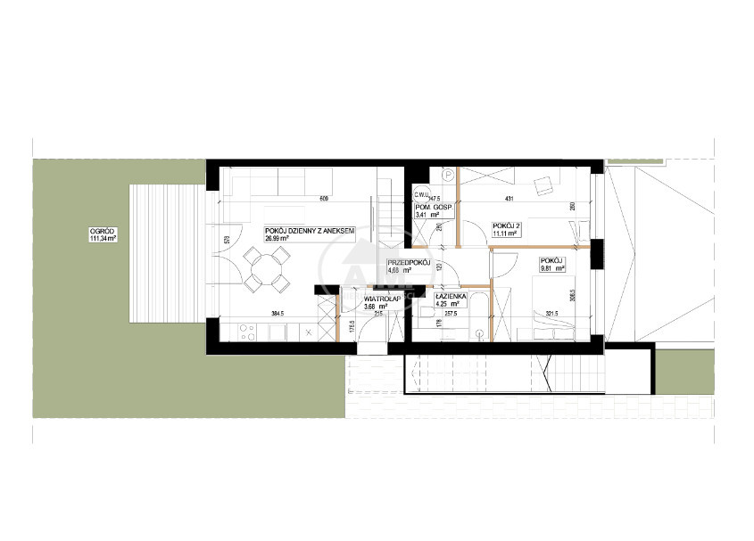 Lokal posiada osobne wejście i składa się z salonu z aneksem kuchennym, dwóch oddzielnych pokoi, łazienki, wiatrołapu, pomieszczenia gospodarczego oraz ogrodu o powierzchni około 111 m2