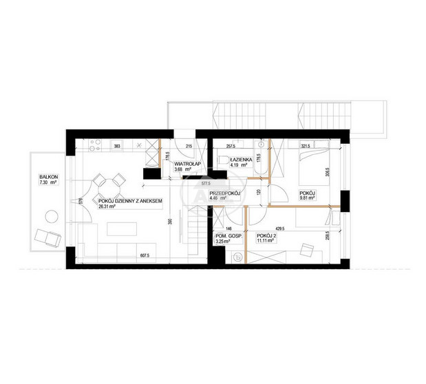 Lokal posiada osobne wejście i składa się z salonu z aneksem kuchennym, dwóch oddzielnych pokoi, łazienki, wiatrołapu, pomieszczenia gospodarczego oraz ogrodu o powierzchni około 144 m2