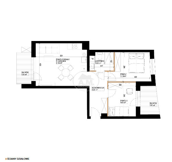 Dwustronne mieszkanie składa się z salonu z aneksem kuchennym, dwóch pokoi, łazienki, przedpokoju oraz dwóch balkonów, które stanowią doskonałe miejsce do wypoczynku.