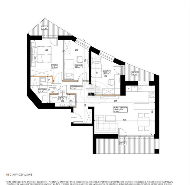 Mieszkanie składa się z salonu z aneksem kuchennym, trzech pokoi, dwóch łazienek, przedpokoju oraz trzech balkonów, które stanowią doskonałe miejsce do wypoczynku.