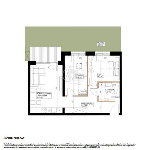 Mieszkanie składa się z salonu z aneksem kuchennym, sypialni, oddzielnego pokoju, łazienki, przedpokoju oraz ogródka, który stanowi doskonałe miejsce do wypoczynku.