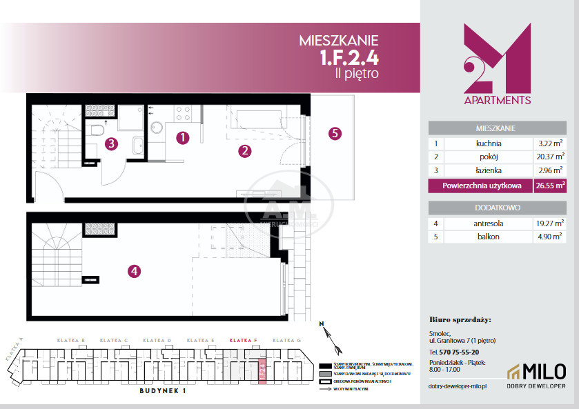 Oferujemy funkcjonalne mieszkanie o powierzchni użytkowej 45,82 m². Lokal składa się z salonu z aneksem kuchennym o łącznej powierzchni 23,58 m², łazienki 2,96 m² oraz antresoli 19,26 m². Dodatkowym atutem jest balkon o powierzchni 4,90 m².