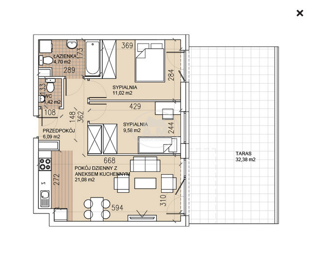 Funkcjonalne mieszkanie z dużym tarasem.