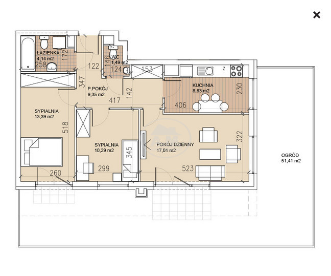 Narożne mieszkanie z osobną kuchnią i dużym ogrodem.
