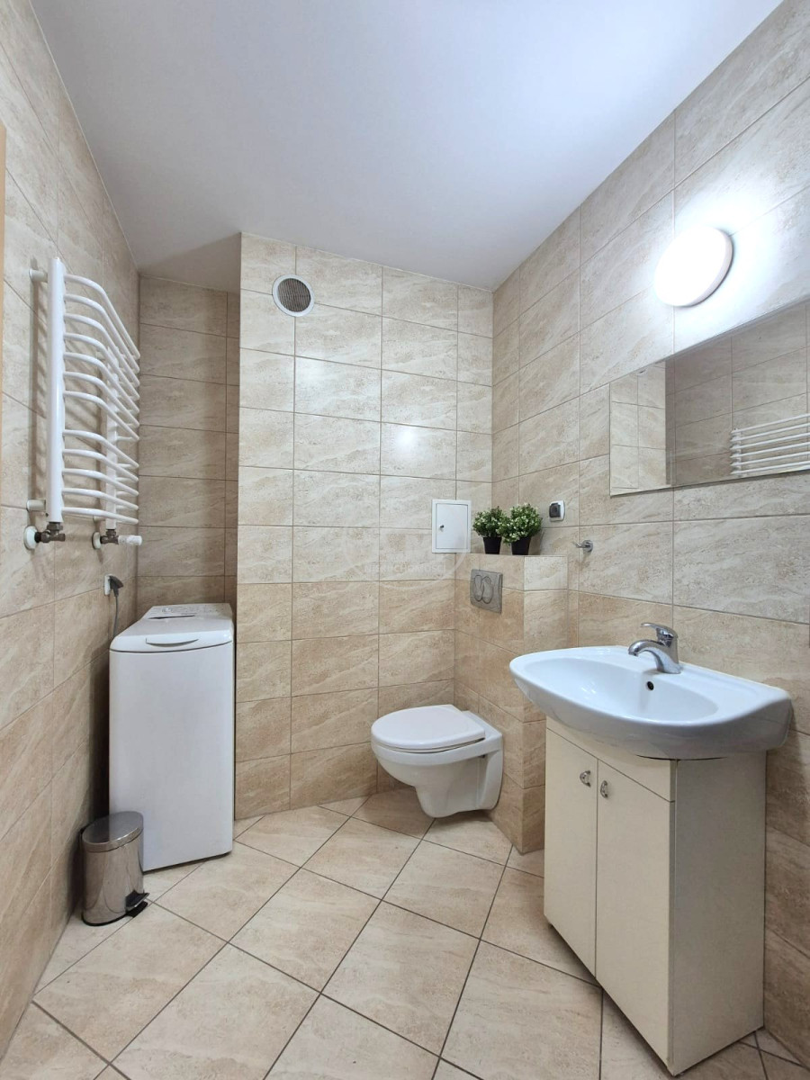 • przestronna łazienka z kabiną prysznicową i pralką,