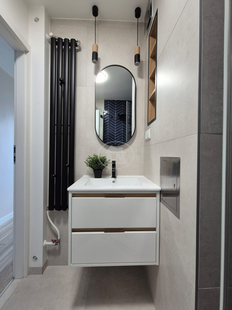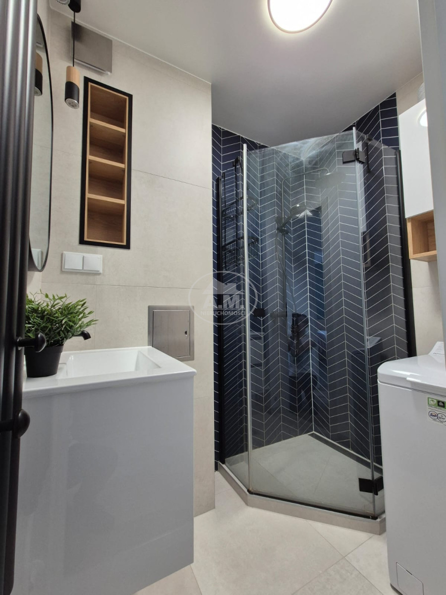 • Łazienka - kabina prysznicowa, jasna glazura, pralka oraz praktyczne półki.